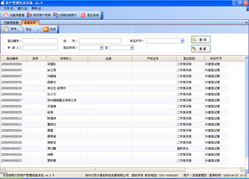 信息发布子系统是房地产交易信息公开发布的系统。可实时获取数据库中的登记办理情况和楼盘交易数据,按照系统设置导出成数据包,利用门户网站发布相应的办理结果信息、房地产市场信息等,实现信息公开和房产市场预警预报。
